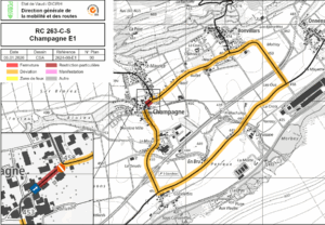 Pour descendre le village, merci d’emprunter la déviation selon les indications de la Direction générale de la mobilité et des routes (DGMR) qui correspond au tracé en orange sur le plan ci-dessous.